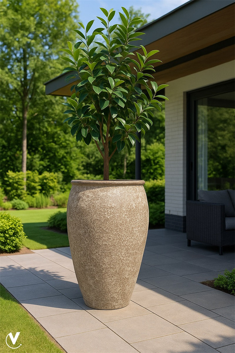 Handgemaakt van geharde klei en op hoge temperaturen gebakken waardoor het een steenachtige structuur krijgt en zeer sterk en duurzaam is. Elk exemplaar is uniek van kleur.- Geschikt voor binnen en buiten- Binnenmaat: Ø42cm- Diepte binnenpot: 118cm